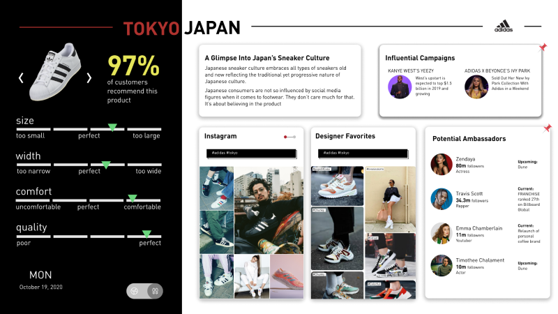 fashion hubs, a social media widget to identify trends, and sales summaries that indicate fashion sneakers'