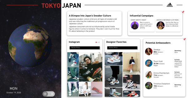Our final design has a strong global element to it, where the control changes between locations and our widgets change accordingly: users can get a peak into each region’s fashion favorites